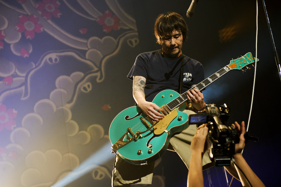 そのたっぷりの時間を使って、横山は終始、語り続けていた。演奏と同じくらいの時間をかけ、同じくらいの熱量を込めて、客席に言葉を投げ続ける。安定のシモネタや最近ブームらしい「コマさん」ネタで盛り上がる場面があり、なぜ日の丸を掲げるのかを熱弁し、明日で5年だと東北に思いを馳せるシーンが多々あった。さらには演奏に入る前、これはどんな気持ちで作った歌、どんなふうに受け止めて欲しいと、一曲ごとの簡単な説明も加えていく。そうして演奏しながらもスタンドマイクを移動させ、アリーナの歌声を、観客それぞれの声をなるべく聞き取ろうと動き回る。つまり、このライブの中心にあったのは、声であり、対話であった。