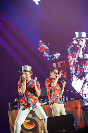 MCでは、「憧れの、憧れていいのかもわからないくらいの孤高の存在」(のっち)と電気グルーヴへの愛を語ったPerfume。初めて電気グルーヴのライブを観たのが、中田ヤスタカの楽曲の良さを知るために、2004年の『WIRE』(石野卓球オーガナイズのレイヴイベント)に行った時だという。「当時はなんで大人たちが盛り上がってるのかマジでわからなかったの。ステージ上ではおじさんがふざけるのね、セグウェイ乗ったりしとって。『なんじゃこりゃ!』って(笑)」「でも、その良さに気づいてからは今は大ファンになって。対バンが叶ったっていうのがほんと夢のよう!」とあ〜ちゃんが語った。