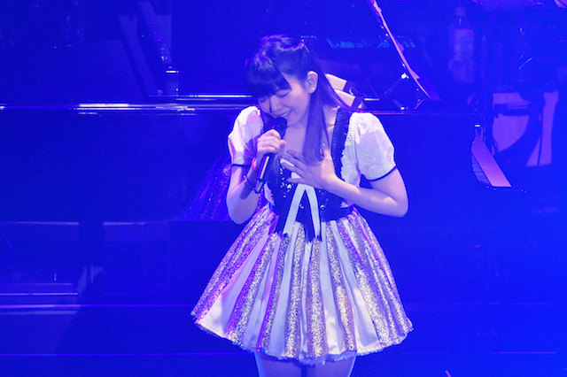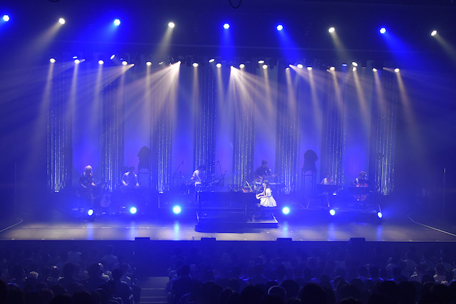 もともと彼女のライブは、音大卒の経歴を持つピアノ演奏や独特のシルキーボイスを活かすため、長らく「コンサート」形式が取られていた。とはいえこの日は冒頭から四つ打ちのEDMに乗ってダンサー2人と踊るアグレッシブな展開。そのまま『サクラダリセット』の12話までのOP曲「Reset」に繋げると、「座ってる場合じゃない!」と観客を煽り、大歓声の中「夏休みの宿題」に突入する。ここでシアター式の会場は早くもスタンディングのライブハウスのようになり、その後もライブアレンジされた「ふわふわ♪」や「88秒フライト」をダンサーと踊りながら披露。「ライブ」モードを強調して興奮度を一気に上げていく。