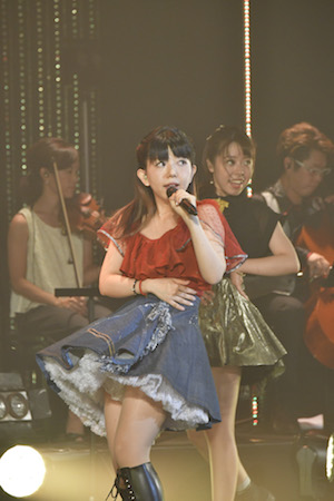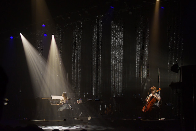 とはいえ、ピアノを生かしたしっとりとした楽曲も彼女の魅力。「たったひとつ」からは一転「コンサート」モードに切り替えて、そのままクラシックコーナーに突入し、まずは岩井俊二監督作『LOVE LETTER』で自身が演奏を担当した「A Winter Story」をピアノで独奏。その後バイオリンの丸山美里とチェロ担当で音大時代の同級生・渡邉雅弦を迎えて、パッヘルベルの「カノン」を披露する。歌い踊る「ライブ」で盛り上げ、聴かせる「コンサート」で起伏を作る。アカデミックな音楽とポップスとを自在に行き来する雰囲気は彼女ならではだ。