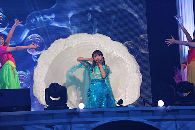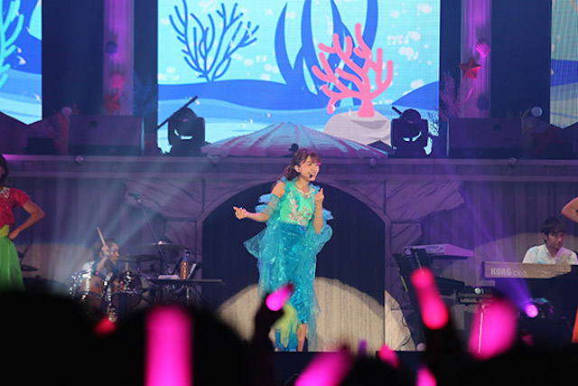 ところが、物語はこのままでは終わらない。突如雷が鳴り雨雲が現われると、彼女の母親に扮した『探偵オペラミルキィホームズ』(TOKYO MXほか)にも出演する佐々木未来のナレーションで、「人魚はトロピカルムーンに雲がかかり満月が欠けると、元の姿に戻ってしまう」ことが明かされる。以降はギターサウンド全開の「Spinning Stars」や「サキワフハナ」を通して、歌声の力で天気を取り戻すために奮闘。そして「Colorful Girl」で傘を使ったダンスや、MIMORIN BLADEの色を会場一体となって高速で切り替える“カラフルタイム”に突入すると、<雨上がりの空に/虹をかけよう>という歌詞を持つ楽曲に合わせて、空が次第に晴れていく。そして「ユニバーページ」では楽しかったパーティーに別れを告げ、トロッコで2階席を周遊しながらふたたび海の底へ。また会場全体が海の中に姿を変え、外の世界を知ったことで改めて分かった海の仲間の大切さを表現するように、「純情DaDanDan」でカニやクラゲに扮したダンサーとステッキを持って踊り、ビッグバンド風の「恋はイリュージョン」ではタップダンスも披露。本編最後、大歓声の中で「スマイリウム」がはじまると、海の住人と陸の住人が入り乱れ、観客に向けた手書きのメッセージがプリントされた紙吹雪が舞って大団円を迎えた。
