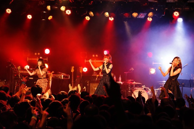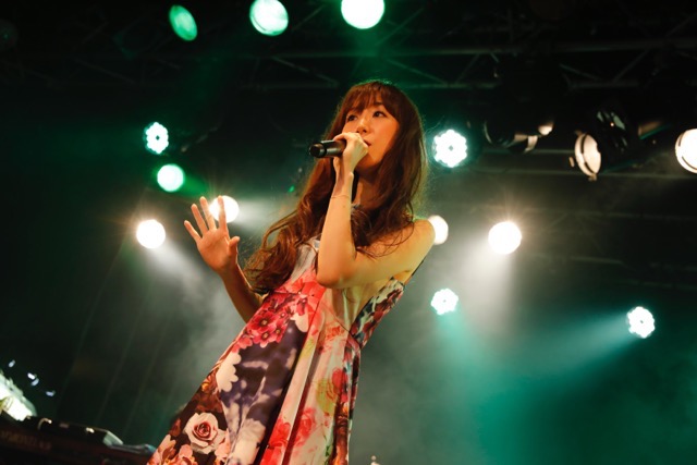 オープニングアクトに抜擢されたMia REGINAは、昨年に結成&デビューしたばかりの女性3人組ボーカルユニット。とはいえメンバー全員が秋葉原ディアステージのキャストとして長く活動しており、TVアニメ『アイカツ!』(テレビ東京ほか)の楽曲を歌うユニット、STAR☆ANISの一員としても数々の大舞台を経験している実力者だ。まずは和装ハイパーメタルといった趣きのアップナンバー「蝶結びアミュレット」で会場のボルテージを一気に上げると、続く「ガールズ・オンリー・ミラクル!」ではキュートなモードに一変。多彩な曲調とそれに合わせて様変わりする3声のボーカルワークという、彼女たちのカラフルな持ち味が発揮される。ラストは田中秀和(MONACA)が手がけるディスコチューン「THAT'S A FACT! 〜千里の道も一歩から〜」を披露。Wild Cherry「Play That Funky Music」ばりのファンキーなギターリフと共に華々しいダンス空間を作り出し、見事にオープナーとしての役割を果たした。彼女たちのみオケを流してのライブではあったが、3人の多様な歌声を活かした色鮮やかなチャームが発揮されていたように思う。