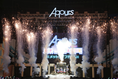 そんなAqours、ライブに関しては今年2月に横浜アリーナで開催した1stライブ『ラブライブ!サンシャイン!! Aqours First LoveLive! ~Step! ZERO to ONE~』を経て、今回が初のツアーであり、本公演はそのファイナルを飾るもの。ライブは最新ナンバリングシングルのタイトルでありツアータイトルにもなっている『HAPPY PARTY TRAIN』にちなみ、汽車に乗ってAqoursのメンバーがメットライフドームへ向かうアニメ映像からスタート。「埼玉」を経由して、いまの勢いを示すように、汽車はトップスピードで加速したあと、9人がメットライフドームのステージへ降り立った。