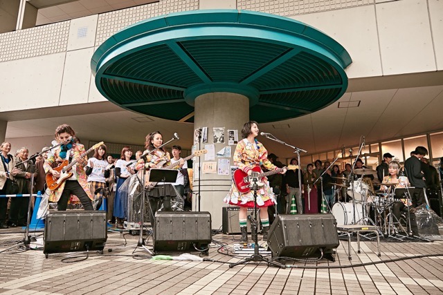 この日のライブは、事前に「キャンパス内にソーラー・パワー・トラックで乗り付け、突撃ライブを敢行」とアナウンスされていたが、あいにくの雨模様となり、急遽キャンパス入り口でのライブに変更に。それでも特注の鉛蓄電池に溜まった電気を使って、万全のパフォーマンスを繰り広げた。