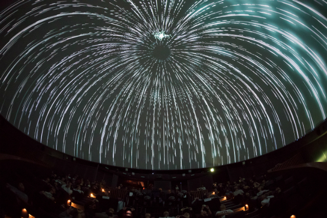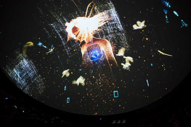 まず編集部では、VRシューティングゲームソフト・Rez Infiniteをプレイする模様を、通常プラネタリウムに利用されているドームシアターに投影し、100人で同時にゲームを体験する特別パフォーマンスを体験した。同パフォーマンスはゲームのプロデューサー・水口哲也氏も参加し、全5回を実施。6月に開催された「VR to Dome 実験:Rez Infinite」に続く第二弾イベントとなった。第一弾イベントも見ていたというジェイ氏は、前回からの変化について以下のように教えてくれた。