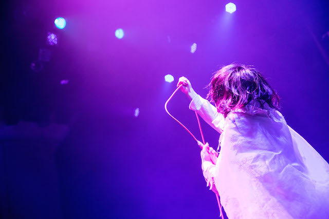 先攻は大森靖子。暗めの照明の中、白い衣装の彼女が一人でステージに登場した。過去の楽曲に新曲も加えた弾き語りを主軸とするベストアルバム『MUTEKI』を9月にリリースした大森。同アルバムの全国ツアー中である彼女は、この日も弾き語りに比重を置いたライブを展開した。1曲目、モノローグから叫びまで縦横に、“東京という街で生きること”について歌う新曲が披露される。鼓膜を震わせるほどの絶叫は、どんな暴力的なエフェクターやサンプラーが発する重低音より、コントロールされた上で強度を増していた。