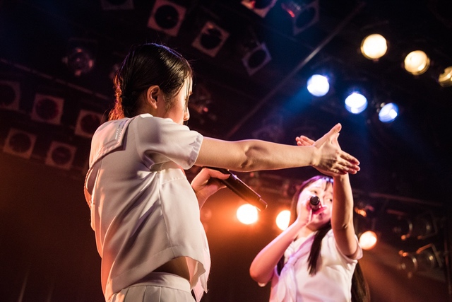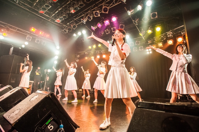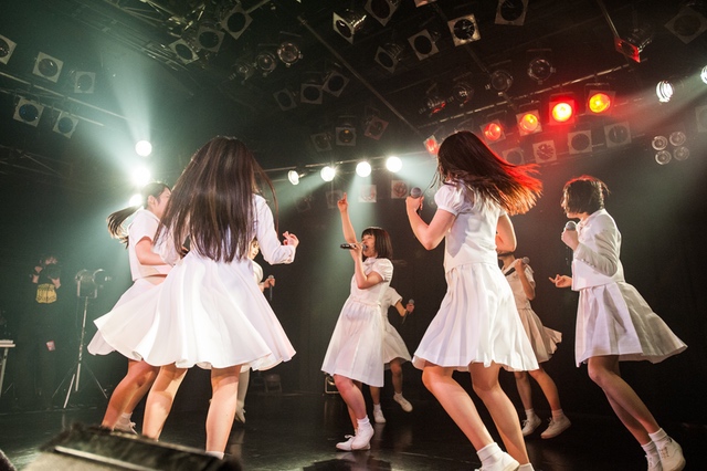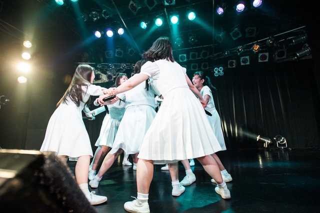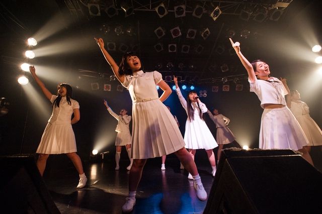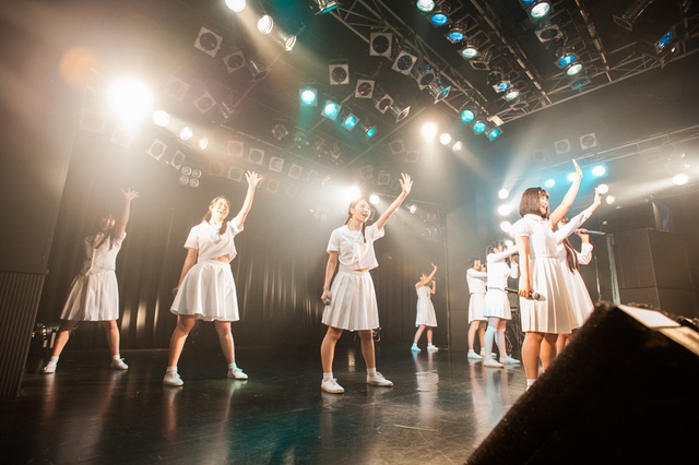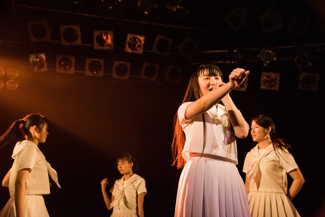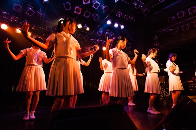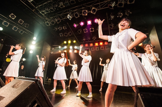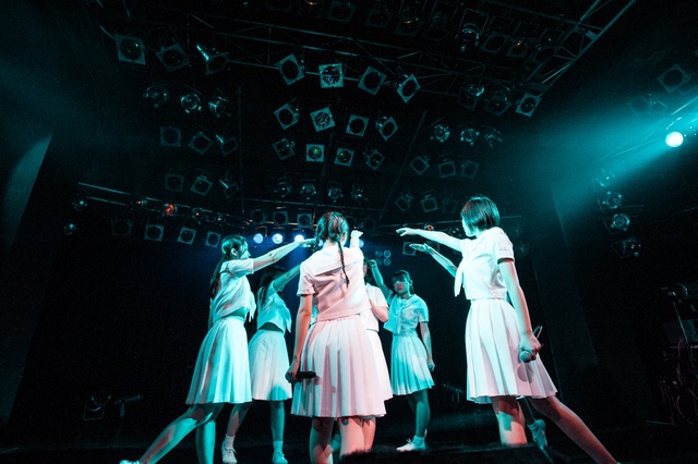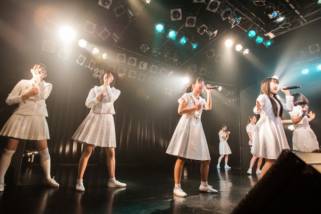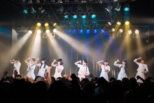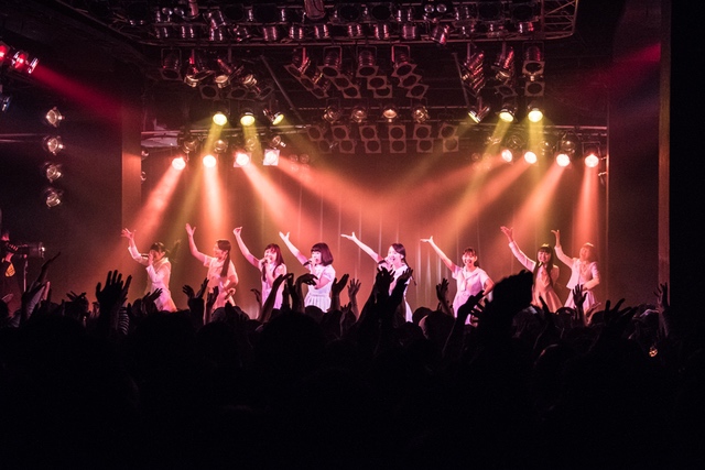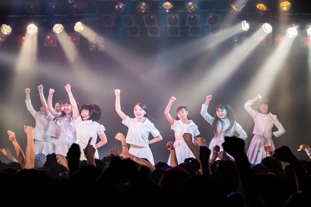 この日披露された25曲は、ファンのリクエスト投票結果を反映し、メンバーの感謝の気持ちとグループの集大成が詰まったセットリスト。熱気に満ちたフロアの盛り上がりとそれに溢れんばかりの気迫とパフォーマンスで応える8人。メンバー一人ひとりがそれぞれ身に纏った歴代の制服からの衣装チェンジを挟んだ9曲目までの中で、特筆すべきはBase Ball Bear feat.RHYMESTERの「The Cut」だろう。lyrical schoolとのコラボユニット・リリカルネッサンスとして、昨年1月に初披露され、CDとしても音源化されたこの楽曲。小出のボーカルパートをアイドルネッサンス、RHYMESTERのラップパートをlyrical schoolが担当していたが、lyrical schoolのメンバー変更により、昨年2月のリリースパーティー以降は披露されることはなかった。「The Cut」が再び息を吹き返したのは、今年1月にCLUB CITTA’にて開催された『年またぎ!名曲ルネッサンス全曲披露ライブ』でのこと。“全曲披露”と銘打たれていたこともあり、「The Cut」の披露は事前に予想されていたものであったが、蓋を開ければ全パートをアイドルネッサンス8人がマイクを繋いでいく、キレキレのパフォーマンスに進化を遂げていたのだ。CLUB CITTA’での公演が実質のところ、解散発表前の最後のライブであったため、アイドルネッサンスとしての「The Cut」は、計2回のみの披露となった。横一列に並んだメンバーが鋭い眼差しでフロアを指差すサビの振り、何よりも確実に上達していくマイクリレーは、素直に「続きが観たい」と思わせる未知の凄みを持ち合わせていた。