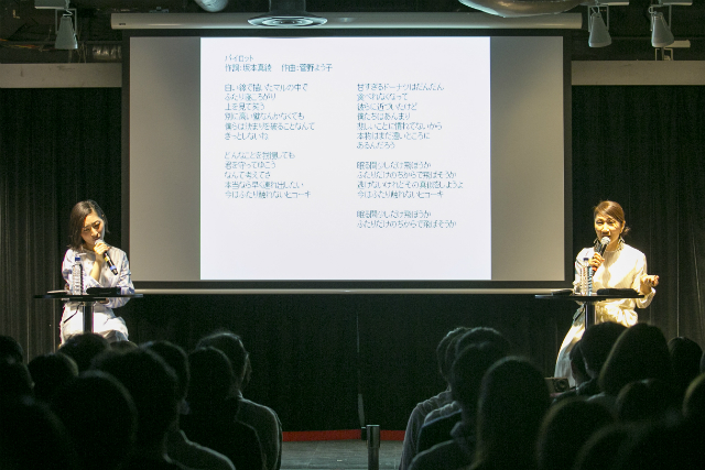 イベントのラストを飾るゲストとして登場したのは、坂本真綾。アーティスト・声優として活動している坂本は、自身の楽曲の作詞にとどまらず、他アーティストへの楽曲提供も行う作詞家としての顔を持つ。8歳から子役として活躍し、1996年のシングル「約束はいらない」で歌手デビュー。その作詞を岩里が担当して以来、二人は20年以上の付き合いとなる。