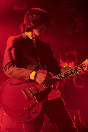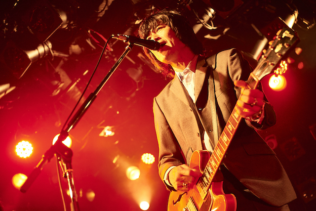 長いキャリアを一足飛びにするセットを、4人のメンバーは自然体で進めていく。山森“JEFF”正之(Ba)は2014年から、古沢 'cozi'岳之(Dr)は2017年から加入したメンバーであることをうっかり忘れてしまいそうだ。こと、古沢のドラミングは武道館前哨戦で見たクアトロの時とは余裕がまるで違う。ミドルテンポの「希望の船」。加藤の甘い歌声、古市コータロー(Gt)のソロパートに酔いしれた後は、力強い三連のリズムが曲を引き締めていく。「華のあるシンガーとギタリスト」の組合せは優れたロックバンドに必要不可欠だが、かといってそれだけでは成立しない。ボトムの強さ、曲にメリハリを与えるリズム。そういうものに支えられてこそカリスマの魅力は増していく。加藤がいつも以上にキラキラ輝き、古市がことさらセクシーに見えたこの日は、つまり4人がバンドとして盤石になってきた、ということなのだろう。