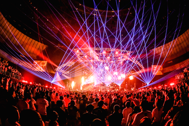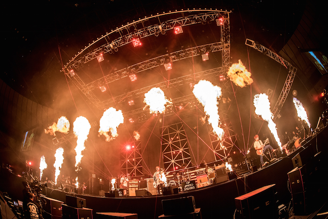 ステージ後方に設置された階段から登場した4人は凄まじい歓声を浴びながら、定位置に着く。ドカン! という爆音の火花とともに放たれたオープニングナンバーは「fiction」。さらに「escape」「knife」「Chicken race」とライブアンセムを次々と披露し、スタンディング形式のセンター席では当然のようにモッシュが巻き起こる。炎、レーザーなどの演出も派手。“せっかくのアリーナなんだから、やれることは全部やる”という気合いが伝わってくる。