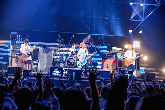 「名古屋の旗を持って、横アリ城を攻めに来ました!」というキャッチーなフレーズで最初のMCを始めたGEN(Ba/Vo)。「ただの兄ちゃんだった俺らがここまで来た。これはヒーローになるまでのストーリーじゃなくて、ヒーローになってからのストーリーなんですよ。わかってる?」と最新シングル「My HERO」を演奏する。“楽曲に込めたメッセージ、ストーリーをわかりやすい言葉で伝えたうえで演奏を始める”というスタイルも、フォーリミのライブの魅力。煽りと語りと楽曲を一体化させ、感情と肉体の両面でオーディエンスの高揚感を上げていくGENのステージングセンスは本当にすごい。また「drops」では<ピッチ ピッチ>というポップに振り切ったサビに合わせて観客が両手を上げる。こんなにかわいいフレーズ(じつは切ない曲というのもポイント)で盛り上がれるメロコアバンドはまちがいなく彼らだけだろう。