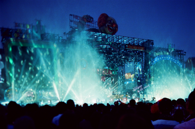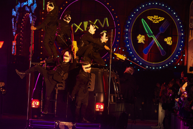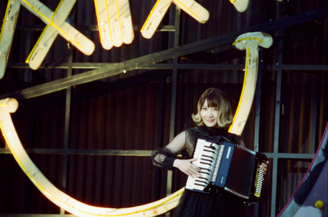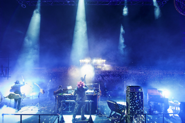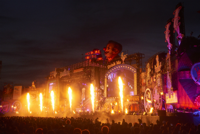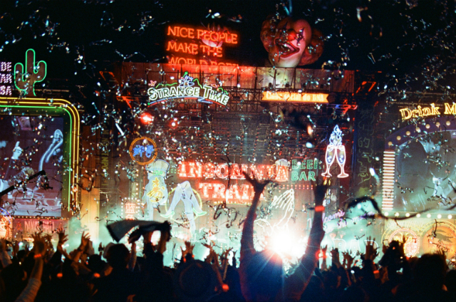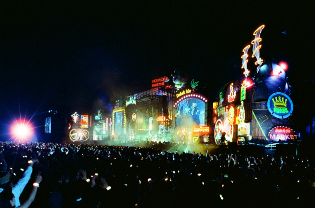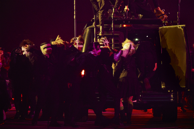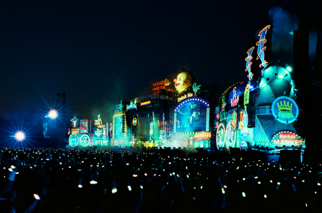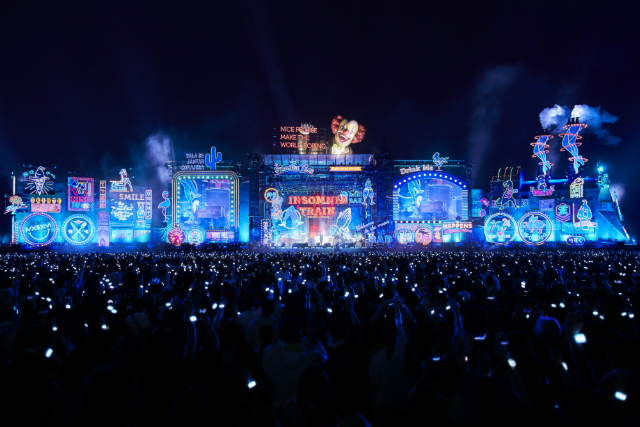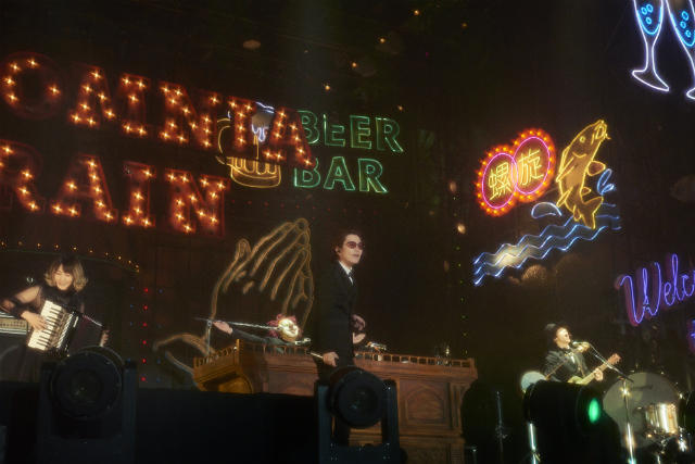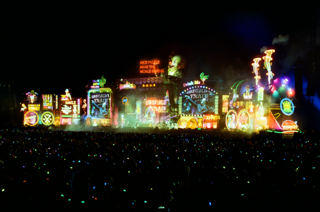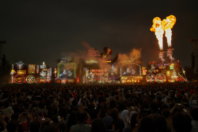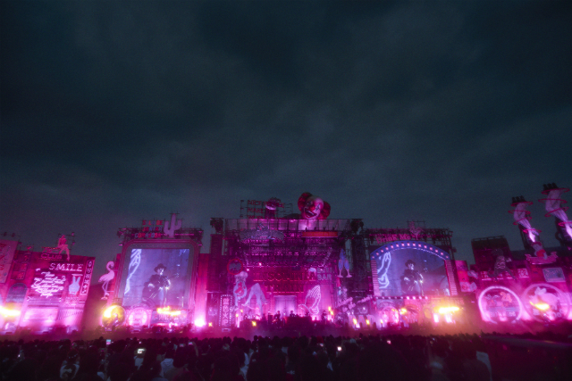 SEKAI NO OWARIの野外ライブといえば、これまではステージ中央に鎮座してきた巨大樹に代表される、自然やファンタジーの世界が主なモチーフとされてきたが、「INSOMNIA TRAIN」(=不眠症列車)と名付けられた今回のツアーはまったくその様相が異なっていた。ステージに展開されていたのは、色彩はアジア的ながらネオンのビルボードには英語やスペイン語も混じり合う、時代も場所も定かではないどこかの都市の歓楽街。各会場、ライブは夕暮れから夜にかけておこなわれたが(周到にも、各公演の曲順もライブ当日の日の長さに応じて細かく入れ替えられていた)、特に周囲が暗くなってからすべてのネオンが発光したセットは壮観の一言。ただ美しいだけでなく、簡単には飲み込めない異物感のようなものが常にどこかにつきまとう悪夢のような光景だった。