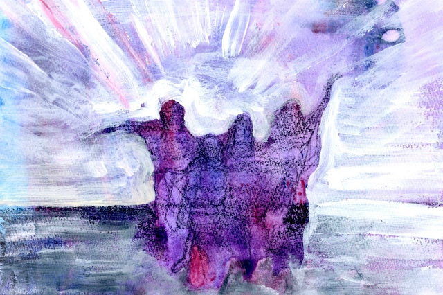 続いてスクリーンを埋め尽くす、蒼と紫を基調とした絵の具がガラスの上で混ざり合う映像は、どうしてもロールシャッハテストを想起してしまう。観客全員が被験者。けれどブクガの4人はドクターでもセラピストでもなく、絵の具の海を漂う精霊だ。