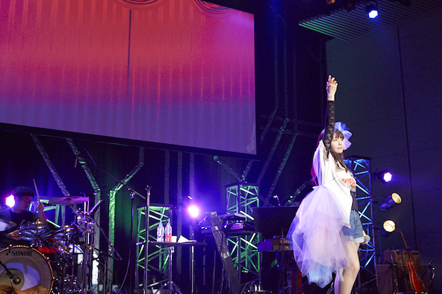 会場が一体となって〈ビーフ! ビーフ!〉と盛り上がった後は、3rdアルバム『Lyrical Concerto』より星空を思わせる壮大なロックチューン「Starline」を披露。照明や観客のサイリウムを含め一面青色に染まったホールに、先ほどよりもグッと大人っぽさを増したクールな歌声を力強く響き渡らせていく。「青い光がめちゃめちゃキレイでした!」と喜ぶ竹達は「今回はちょっと懐かしい歌だったり、私が久々に歌いたいなあと思う曲を選抜したセットリストになっております」と説明。「昔は難しいことを言ってるなと思ってたんだけど、もうすぐ30歳を迎える今、歌えば歌うほど好きだなと思うようになった曲」と語り、2ndアルバム『Colore Serenata』収録の「永遠にキミのことを愛したいと言わせて」を歌い始める。サンボマスターの山口隆が詞曲を提供したこのナンバー、まだ見ぬ理想の恋に恋い焦がれる気持ちが綴られた歌詞という解釈が可能で、曲の最初と最後に置かれた語りのパート、締め括りの〈伝えたい〉と4回連続で叫ぶ箇所を含め、アーティスト活動6年目を迎えた今の彼女だからこそできる表現になっていたように思う。