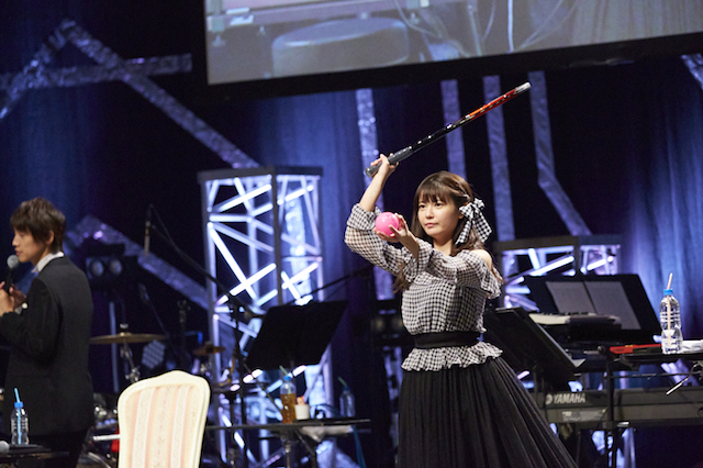 例年通り司会進行役を務めたニッポン放送の吉田尚記アナウンサーに呼び込まれて「こーんにーちはー」と登場した竹達は、直前までステージ裏でボール遊びをしていたとのことで、緊張感はまったくなし。ショルダーレスのトップスに黒のロングスカート、頭にはトップスと同じチェック柄のリボンを合わせた、ナチュラルな大人かわいいコーデが見目麗しい。吉田アナの「(20代最後の年であるにも関わらず)1ミリも悲壮感ありませんよね?」という指摘に、「なんか悲しむことあります?」とあくまで自然体だ。とはいえ30代になることには多少のプレッシャーもあるようで、仕事の現場で責任の重みが上がるであろうことを憂いていたが、吉田アナの「竹達さんだからなー」との声に「えっ、どういうこと?」と軽妙なツッコミを入れてお客さんを笑わせる。