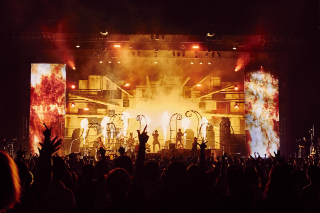 プロジェクションマッピングでネジやスパナが宙を飛び交い、組み上げられていく映像が映し出され、ステージに据えられた4つの白い布で覆われた謎の物体に照明が当たり、今井寿(Gt)、星野英彦(Gt)、樋口豊(Ba)、ヤガミ・トール(Dr)のシルエットが浮かんでは砕け散るというワクワクする演出の中、ライブはアルバムのオープニングを飾る「零式13型「愛」」で幕を開けた。布の中からメンバーが姿を表し、ステージ後方から軍帽にマント姿の櫻井敦司(Vo)が登場すると大歓声。打ち鳴らされるヤガミの力強いドラムはまるで鼓動のよう。スクリーンには胎児が映し出され、ドラマティックで重厚なナンバーが“愛”の誕生を祝福する。