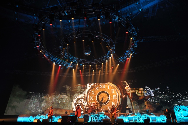 開演時間を少し過ぎ、会場が暗転するとスクリーンに雨の中を飛ぶ飛空艇が映し出される。その飛空艇は15年の月日をタイムスリップするかのように巻戻る時計とともに時空を飛び越える。時計の針はシドの結成年である“2003”まで巻き戻ったのち、少し進み“2011”を指したところで止まり、歓声に包まれる中、メンバーが登場した。