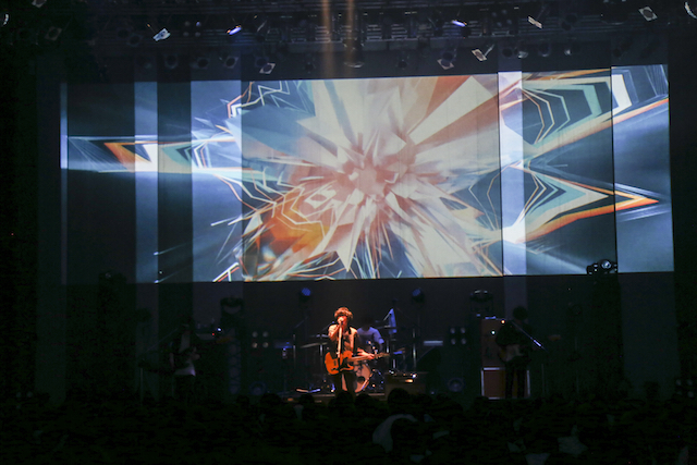 高校時代から共に歩むメンバー間の仲の良さを見せつけるMCを挟み、ピンクの優しい光がステージを包む中で演奏した「怪獣とまぼろしの国」は、Halo at 四畳半が持つ陽の気を象徴するような楽曲。牧歌的で開放感のあるメロディ、童謡の世界を彷彿させる歌詞が、柔らかな空気を会場に吹き込む。ライブも終盤に差し掛かり、人気曲「リバース・デイ」。オレンジ色のライトがステージを照らし、後方のライトによる逆光がメンバーの影をステージに映し出す幻想的な風景が眼の前に広がる。物語の終わりの予感を感じさせる中、拳を突き上げて演奏に応える観客の姿も相まって、これまで以上の一体感を感じさせた。