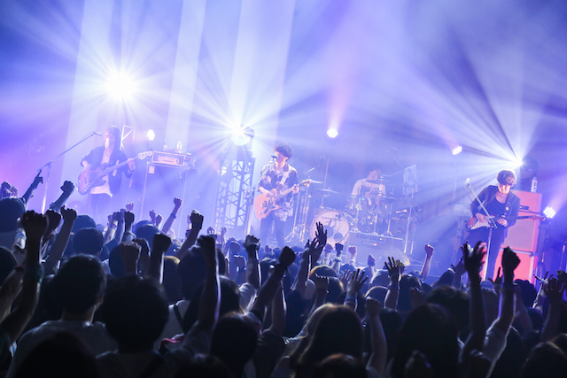 ライブ開演時刻を迎えるとメンバーがステージへ登場し、交信音が途切れると共に『from NOVEL LAND』の一曲目を飾る「スイング・バイ」からライブが幕を開ける。渡井翔汰(Vo)の柔らかさと熱量が同居するボーカル、齋木孝平(Gt)のメロディアスなギター、白井將人(Ba)と片山僚(Dr)の安定したビートがグルーヴを生み出していく。「ステラ・ノヴァ」「飛行船」と徐々に速度を高め、会場を埋め尽くす観客を熱気の渦へと誘った。