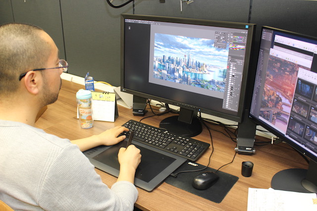 アニメの制作スタジオでは通常、背景画などの美術に関しては専門の制作会社に委託するケースがほとんどだという。しかし、コミックス・ウェーブ・フィルムの場合は、社内に美術部を設けており、それが大きな特色になっているそうだ。同社の美術スタッフである渡邉丞氏は、これまで『雲のむこう、約束の場所』『言の葉の庭』『秒速5センチメートル』『星を追う子ども』『君の名は。』といった新海誠作品の美術を手がけており、同社には欠かせない人材である。特に構造物が多い混み入った背景を描くことに定評があり、上海の高層ビル群を描く必要がある『上海恋』の美術監督に任命されたそうだ。