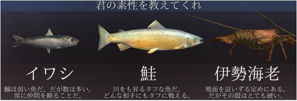 ゲームを起動すると「君の素性を教えてくれ」という言葉とともに、プレイする魚介を選ぶことになる。鰯、鯖、車海老、鮭、伊勢海老……ここから選ぶのか、おれの素性を……。「じゃあせっかくだから一番高級そうなやつで……」と伊勢海老でプレイしたものの、ワサワサと脚を動かしつつ海底を這い回る伊勢海老の勇姿がビジュアル的にちょっとキツかったため、セーブデータを作り直して「鮭」でやり直すことに。脚がワサワサしないから鮭は最高。なんつってもめったに食えない伊勢海老と違って見慣れてるし。