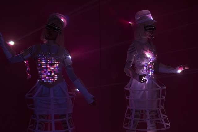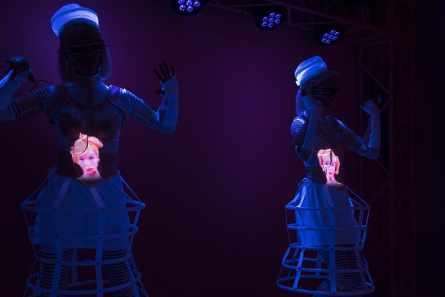 2階へ上がると、ステージに白い衣装を着たFEMMの2体が静止状態で立っている。音楽が流れると彼女らが動き出してダンスパフォーマンスが始まるのだが、曲を重ねるごとに、エンターテックの効果が加えられていくという仕様だ。