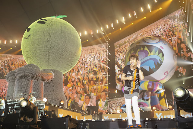 後半は、『ゆずイロハ1997-2017』から90歳になった2人によるナビゲートで、笑いを交えながら<ゆずイロハメドレー>を披露。とは言え、このセクションだけで20曲あり、メドレーの枠を遙かに越えたものになっていた。ステージでは、巨大ゆず太郎(ゆずのマスコットキャラクター)が光りながら動き、目にも楽しく魅せて聴かせる。また「恋の歌謡日」では北川が扮する女性=北見川潤子が登場して、続く「LOVE & PEACH」のときには瞬時に北川に戻っているという、イリュージョン(?)でも楽しませた。