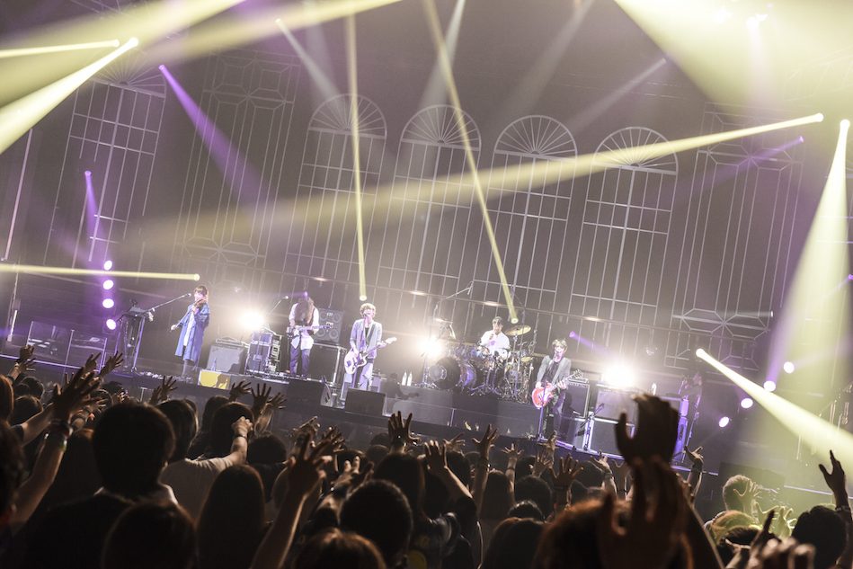 ダブルアンコールを含めて31曲。2時間30分を超えるこの日のライブは、ベートーヴェン「交響曲第9番」をバックに「No.9」にて高らかにスタートした。リアド偉武(Dr)の咆哮にも似た叫び声により、会場の空気が一気に引き締まる。「the cookie crumbles」「#DIV/0!」「Paper-craft」……と、バンドの10年史を振り返るように、次々と楽曲を披露していく。まだメロコアの色が強くあった『and yet, it moves ~正しい地球の廻し方~』までの時期。2010年にリリースしたクラシックを大胆に取り入れた『Roclassick』をターニングポイントに、2013年リリースの『君想う、故に我在り』では表題曲に代表されるような北欧テイストを感じさせるサウンドへも傾倒していく。さらに、2015年『The Vanishing Bride』収録の「ワンダーラスト」では初の打ち込みを採用し、今年リリースの『Fabula Fibula』内の「MUTOPIA」ではダンスビート、いわゆるEDMを取り入れ多くのファンの意表を突くことに成功した。様々なサウンドが鳴り響くライブの中で、ふと脳裏に思い浮かんだのが、以前読んだ金井のインタビューでの一言だった。