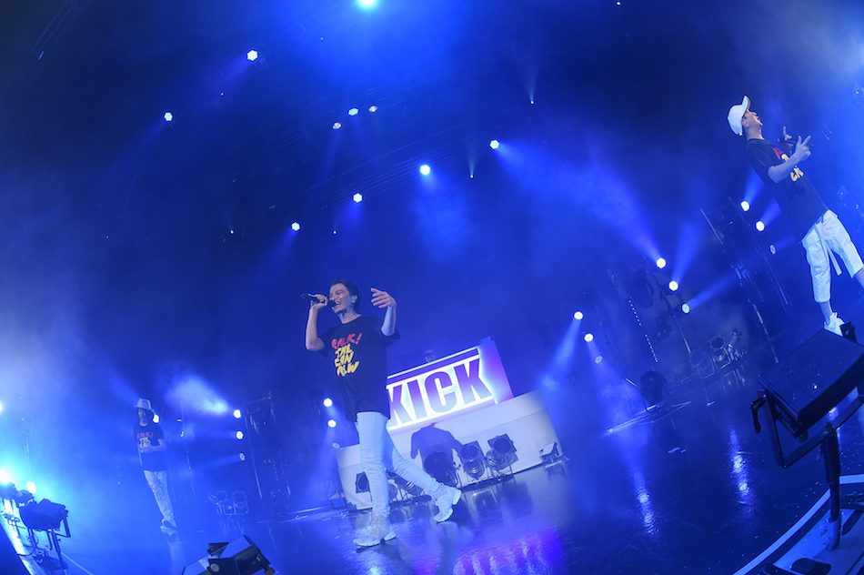「今日をきっかけにお前の人生も『完全チェンジTHEワールド』!」とKREVAの完璧な前振りから始まった「完全チェンジTHEワールド」。初の試みとしてスタンドマイクを使用した「また波を見てる」など、アルバム『KICK!』には、今もなおベストを更新し続けるキックの姿がある。もちろん、楽曲の完成度、瞬く間にマイクをチェンジしていく三位一体のコンビネーションもキックの魅力であるが、おちゃらけと誠実の間を行き来するような、そんなMCもキックとしての本来の姿。とびきり饒舌なKREVAは、お決まりで3回MCUをいじり倒し、MCUはキザなセリフを投げかけては、ファンとコールアンドレスポンスを楽しむ。満を持して話し始めるLITTLEは、しっかりとファンの心をキャッチし、次のナンバーへと流れていく。そんな抱腹絶倒なMCを決められるのも、一心同体のライブパフォーマンスがあってのもの。そんな表裏一体とも言える、ライブパートとMCでの、息のあった3人のコンビネーションがキックの真髄にある。