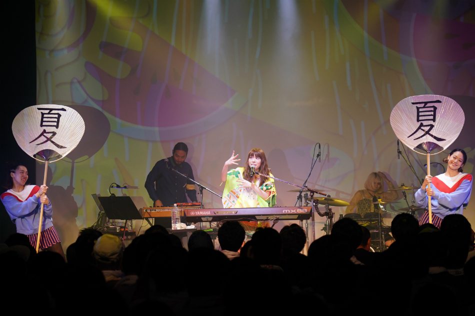 「夏バテするくらい盛り上がろうと思ったけど、2曲で疲れたな」とマイペースなコメントを残すと、アコギを抱えてしっとりと歌を聞かせるコーナーへ突入。「お日様さまさまサマー」ではましのみの愛らしいボーカルを堪能。「どこから見ても綺麗だからね。花火も、君も」と告げて始まった「コレクション of コネクション」では、打ち上げ花火の映像をバックに鍵盤の弾き語りを披露した。恋心と楽しい夏の日の終わりの切なさが交錯する同曲の後には、シリアスな雰囲気で「リスクマネジメント失敗」を歌い上げた。