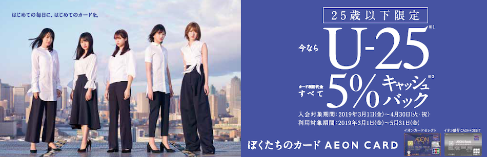 「U-25新生活キャンペーン」は、3月1日から4月30日まで開催される。同期間中には、25歳以下のイオンカード新規入会者に、カード利用額を5%キャッシュバック。条件を満たすと、欅坂46の出演イベントに抽選で招待されるキャンペーンにも応募できる。