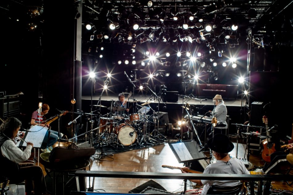 メンバーはステージではなくフロアに、お互い向き合う形で輪になっており、袖から歩いてきた慶一がそこに加わる。円環が完成しただけで早くも熱くなる胸。今夜は観客に向けてのライブでもあるけれど、それ以前に、何よりも各々が「ムーンライダーズ」としての演奏を愉しむためのライブなのではないか、そんなことを感じさせるポジショニングである。