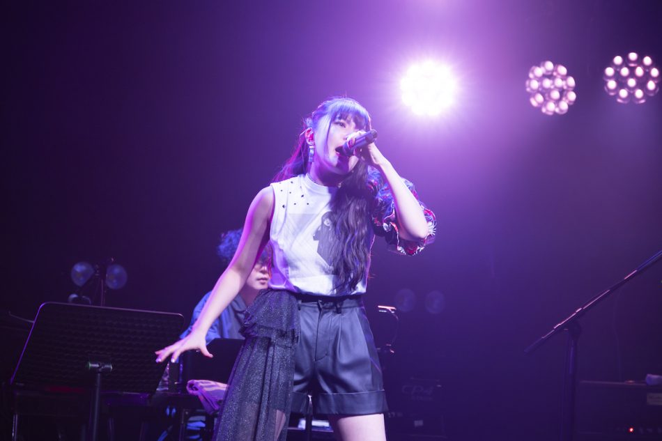 そこから一転、腕を振り上げてクラップを煽りながら、元気いっぱいにパンチの効いた歌声を聴かせた「情熱モラトリアム」、横揺れのリズムに乗って艶めかしいグルーヴを生み出した「赤い果実」と、身体を揺らして盛り上がれる2曲を連発。坂本龍一や槇原敬之のサポートメンバーとしても知られるマルチプレイヤーの毛利泰士(Drum/Manipulation/Percussion)、wacciの因幡始(Keyboard)、森山直太朗ほか多数のアーティストの楽曲を手がける中村タイチ(Guitar/Bass)の敏腕ミュージシャン3人によるバッキングも素晴らしい。