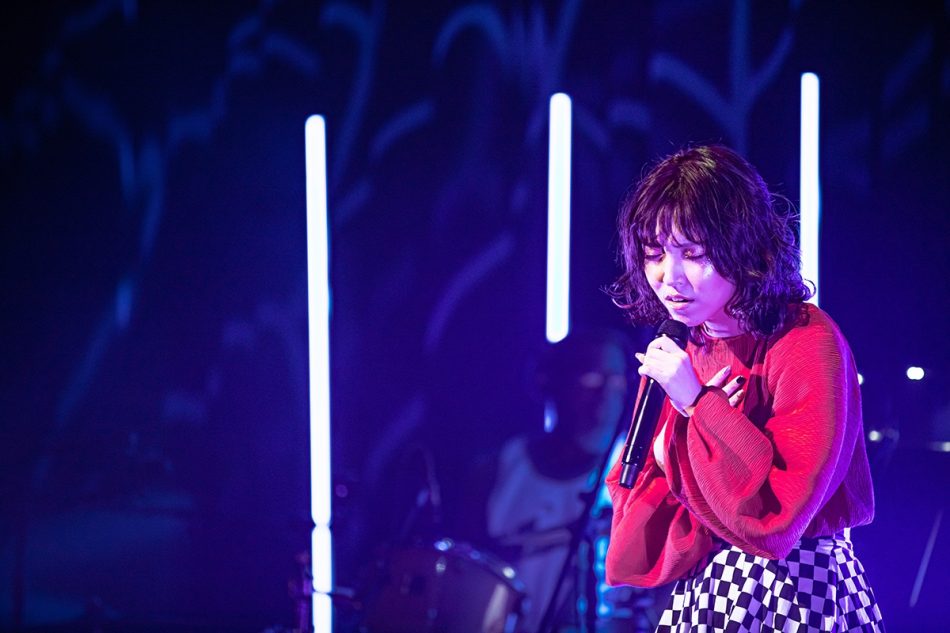 続く3曲目は、ダンサーが一度ステージからはけ、彼女の歌手人生に決定的な影響を与えたというクリスティーナ・アギレラのカバー曲「Beautiful」。前述したオーディションでも同曲カバーを披露し、Jin Nakamuraを圧倒させたというボーカルは、ここまで披露したアッパーなナンバーから一変、ピアノのみの演奏をバックに情感溢れる歌声を響かせる。