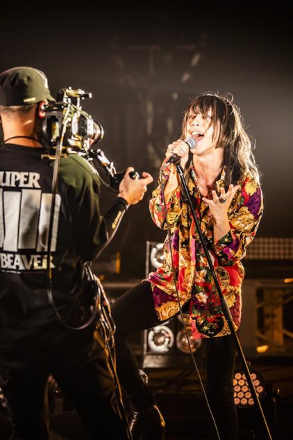 「これが俺たちの戦い方」という言葉とともに攻撃的なサウンドがぶちかまされた「正攻法」に続いて、「何があるかわからないから、一瞬で終わるから、少しも目を離さないようにお願いします」と渋谷が叫んで「閃光」へ――無観客だからこその過剰ともいえるライティング、メンバーにぐいぐいと寄る手持ちカメラにクレーン、そしてアリーナの空間を飛び回るドローンカメラ。こうしたシチュエーションだからこその演出の真ん中で、バンドはひたすら密度の高い演奏を繰り広げる。柳沢が顔をくしゃくしゃにしながらコーラスし、上杉がカメラをにらみつけながらoiコールを上げる。