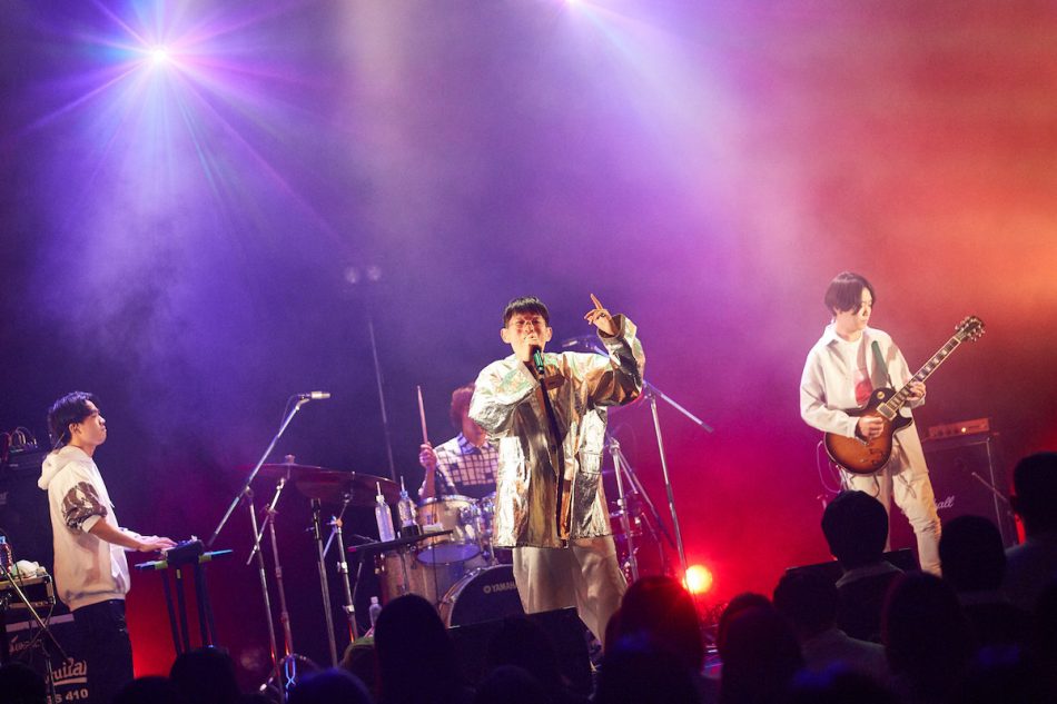 しかも踊れるBPM125(「HOUSE」の歌詞にもある)前後をキープしながら、ビートの種類は多彩だし、曲構成もいくつかに分けられ、1曲の尺が短いせいもあって、思い切り踊りたい曲、ゆらゆら揺れてカームダウンしながら、より歌詞にフォーカスしてリズムをとるぐらいのノリで楽しめる幅の広さもいい。だが、やはりライブでは思い切り踊れることがラッキリの魅力と見受けられ、この日が金曜であることを想起させる熊木幸丸(Vo)のMCから雪崩れ込んだ「Burning Friday Night」、大瀧真央のシンセリフがフワフワとステップを軽くさせる日常感たっぷりの「350ml Galaxy」、ハウスビートと家のダブルミーニングでお馴染みの「HOUSE」は生の熱気を孕んで、階段状の客席は実際揺れるほどサビでジャンプする人の多いこと! ステージ近くの前方なんてソーシャルディスタンスは保たれてるものの、クラブ状態に近い。さらには音源よりぐっとカリプソ系のリズムやスチールパンの音色が立って、中盤以降はプリミティブなアフリカンビートと日本の土着音楽が混交したようなリズムに移行していく「太陽」で、都市のホールを架空のお祭り空間にワープさせてしまう。