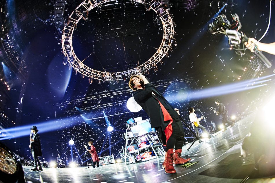 JIROのベースソロからTAKUROのギターソロへと繋がるパートでは「痺れた!」というコメントも。ここで突如、ステージ中央に乱れた映像が流れる無数のモニターが登場。そんな不穏な雰囲気漂うセットを背後にした4人は半円を描くようにステージに立ち、インディーズ時代の激レアの楽曲「Angelus」を披露。TERUの絶叫タイトルコールから始まったのは、ライブの定番曲「彼女の“Modern…”」。砂嵐の流れるモニターを背にステージはさらに激しさを増し、「HIT THE WORLD CHART!」。バックスクリーンやモニター、エフェクトには近未来的な映像が流れ、まるで4人が異空間にいるかのように見える。