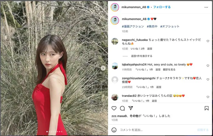 コメント欄には「ドアップの破壊力がやばい」「大人みくりん!可愛すぎる!!」「可愛くてエロい」「表現の幅が無限大!」「ボディメイク頑張ってるよね?すごくレベルアップしてる気がする。」「日に日に良い女になっていく」「朝イチの刺激が習慣化してる」「アップの破壊力、こんなに肌綺麗なのか、もう売れる気しかしなくてニヤニヤしちゃう」など、多くの反響が寄せられている。