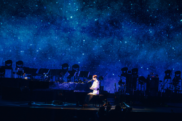 ここからはハイライトの連続だ。その火付け役になったのが「Fly-by (2024 observed ver.)」である。ベストアルバムのタイトルにもなった通り、この曲は初期の代表曲であるばかりか、この15周年の看板だったように思う。背景のスクリーンには宇宙が映し出され、満天の星空を思わせる照明がそのムードを引き立てる。日食なつこはグランドピアノを前にひとりでステージに立ち、無数の出会いと別れについての歌をゆったりと歌い上げていた。鍵盤は銀河を泳ぐように流麗で、彼女の声は寂しいくらい澄んでいる。