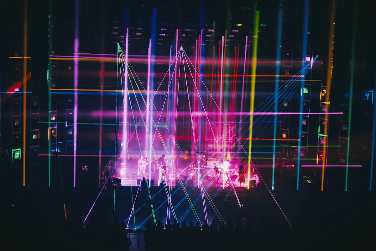 大胆なテンポチェンジが印象的なファンクチューン「sanso」からは、さらにディープなKroiの音楽世界に引きずり込まれた。ギター、ベース、キーボードのユニゾンによるリフ、内田のラップ~メロウなボーカル、長尺&激シブのベースソロが響き合う「Pass Out」、チルな音像のなかで〈触れる肌/ずっとこのままでいたいよ〉という甘いラインが溶け、千葉のジャジーなプレイが色どりを与える「Shincha」。さらに“ぴあアリ”を連呼する短めのセッションを挟み、内田のソウルフルなボーカルが光を放つ「帰路」へ。この日も同期やクリックは一切なし。すべて生音による演奏で、メンバー同士でアイコンタクトを重ねながら多彩なグルーヴを生み出していく様はまさに圧巻だった。アリーナでこれをやれるバンドは、本当に稀だと思う。楽曲のイメージ、演奏のテンションとリンクした照明、映像の独創性も、彼らのライブの大きな武器だろう。