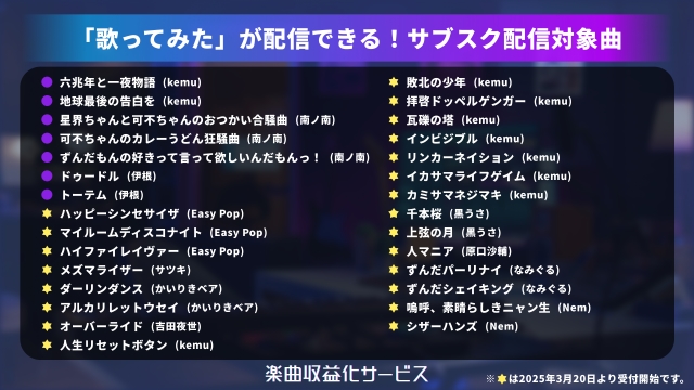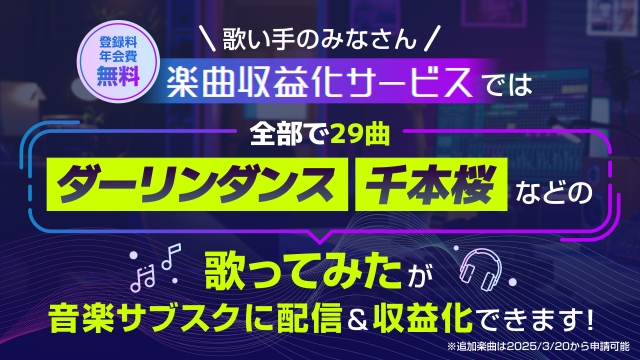 ドワンゴが運営する『楽曲収益化サービス』に、“歌ってみた”のサブスクリプション配信対象曲として新たに22曲が3月20日より追加される。