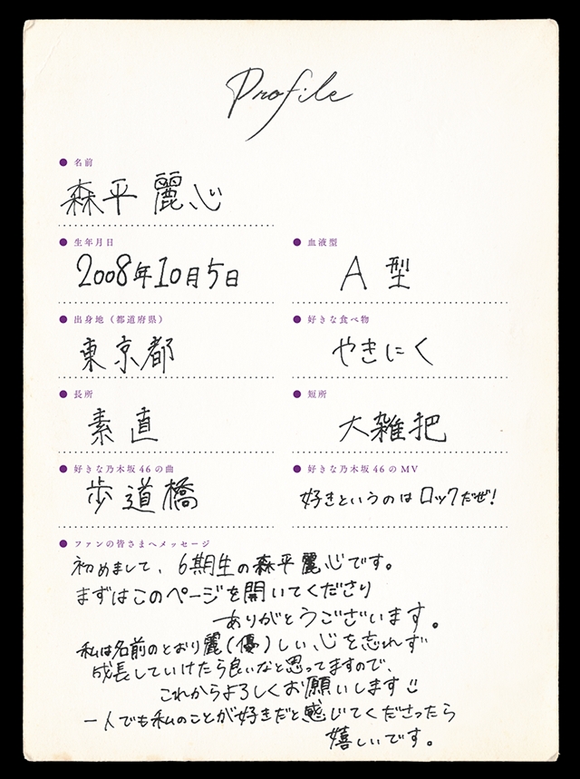 また、本人の手書きプロフィールによって、生年月日や長所/短所などパーソナルな部分や、好きな乃木坂46の曲/MVといった情報、さらにファンへのメッセージなどが公開されている。