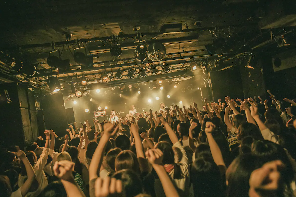 先攻はTETORA。いつものSEに反応した人たちが前へ押し寄せる光景からは、「TETORAからか!」という観客の喜びと驚きが伝わってきた。そして上野羽有音(Vo/Gt)の「高田馬場CLUB PHASE 24周年、周年一発目の音をTETORAから始めます! よろしくお願いします!」という開幕宣言、オープニングナンバー「レイリー」の分厚いロックサウンドに、観客は拳を上げて反応した。日常生活を上手く乗り切るため、人が纏う心の殻を一つずつ剥がし、リスナーの内面に直接語りかけるこの曲は、まごうことなき愛の歌。そのことを示すように、上野は〈私達だ〉と歌いながらフロア一帯をぐるっと指差した。