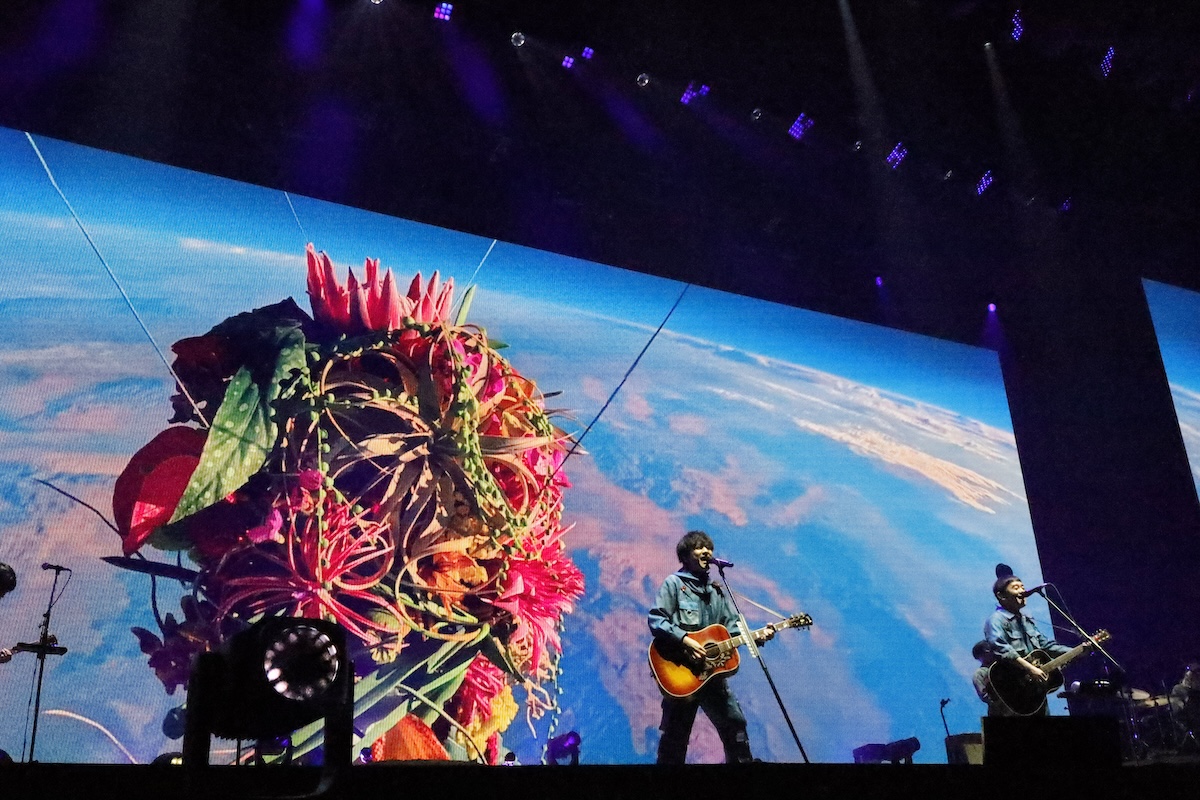 ライブはアルバム『図鑑』と同じ、「Overture -harmonics-」「図鑑」という2曲で幕を開けた。ステージ後部全面を覆い尽くす巨大なビジョンには、アルバム『図鑑』のアートワークから今回のツアー演出まで手掛けたフラワーアーティスト・東信氏が主宰するクリエイション集団「AMKK」による「EXOBIOTANICA3 -Botanical space flight-」とコラボレーションした映像が映し出された。これは地球で育った植物が宇宙へと飛び出し、再び地上に帰還するまでの一連を記録するインスタレーション作品で、2024年9月に、アメリカ・ネバダ州のラブロック砂漠から3度目の打ち上げが行われた。その際のドキュメント撮影と同時期に北川悠仁が単身LAへと渡り、本映像を撮影。植物を乗せて大空を舞う気球や、北川が雄大な砂漠でひとり歩き、高地でギターを鳴らす様子などが、ストリングスを交えた美しいサウンドと共に映し出され、青い地球という星の大きさに圧倒される。「図鑑」はそんな壮大さを歌いながら、〈覚悟決めて dive〉から熱く激しい展開になり、叩きつけるような雨や雷が轟く映像によって、大自然への畏怖までもが表現されたように思えた。ワークウェアのようなデザインの、デニム調の衣装を身に纏った北川と岩沢厚治の2人。ツアー『図鑑』を完成させるためのフィールドワークが、今始まった。