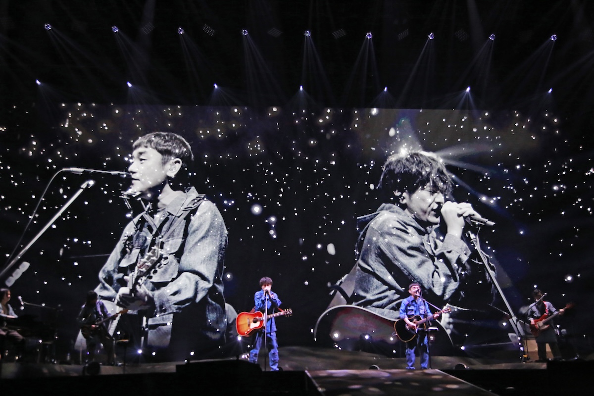 2000年のアルバム『トビラ』収録曲「シャララン」では、ストリングスチームがリコーダー演奏を披露し、歌詞に合わせて2人の幼少時代の写真が映し出されるなど、観客を楽しませ、その後はアルバム『図鑑』から立て続けに披露。ソリッドなロックチューン「つぎはぎ」では、〈音が止まって!〉という歌詞で音が止まる演出。フォーク調で始まり、Queenのようなコーラスやギターが展開し、電車が走る映像と共に届けた「SUBWAY」。その電車の車窓からまばゆい星空を臨むように披露した「十字星」。前半ラストには2003年の疾走感あふれる青春パンク調の楽曲「青」を披露。北川は「行くぞ!」と声をかけてステージを駆け回り、サビやラストのコーラスでは、観客も一緒に拳を掲げての大合唱となった。