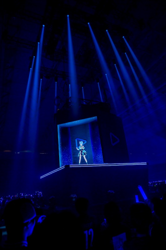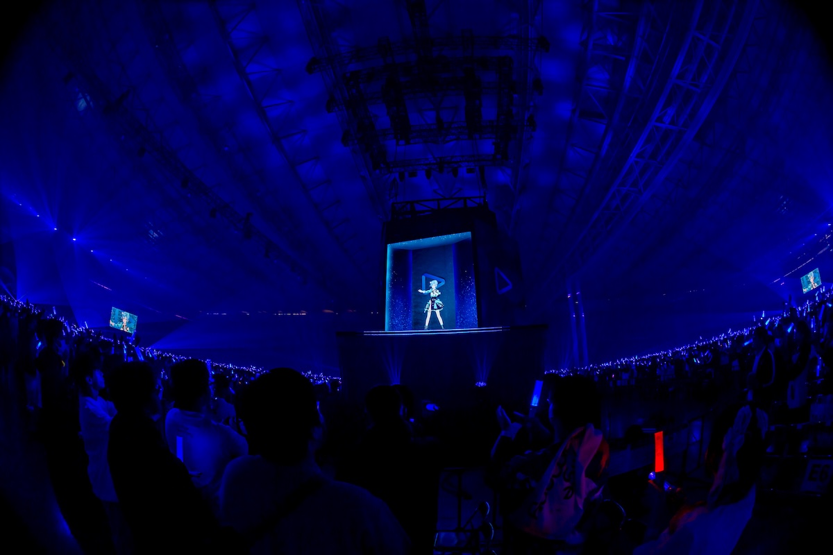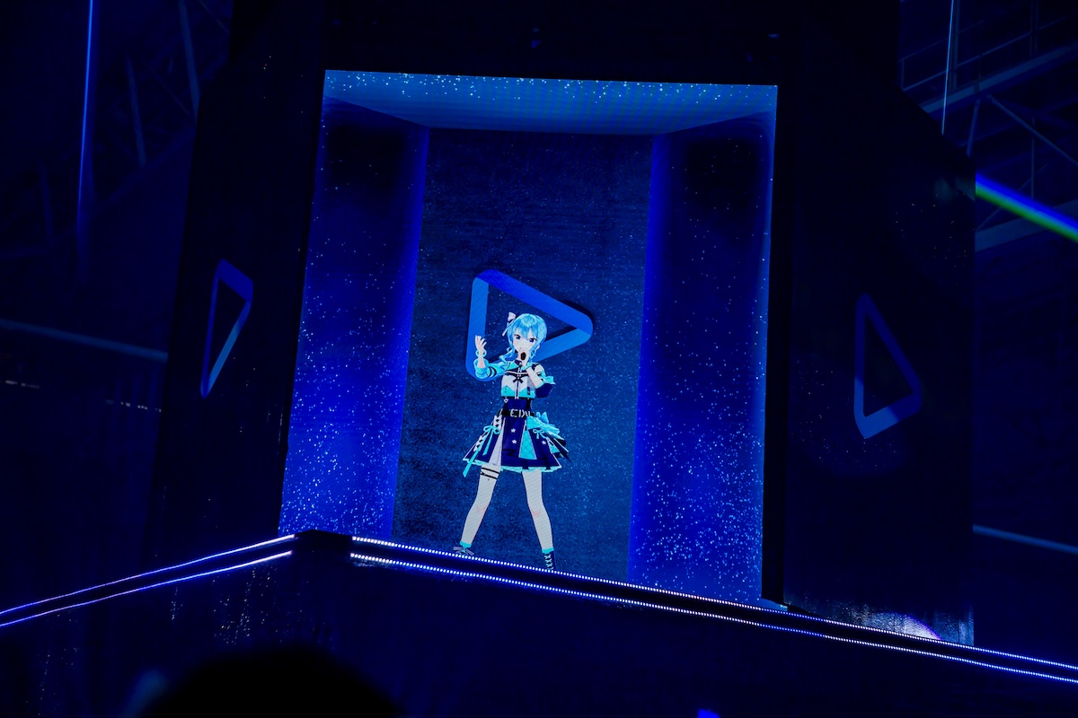 オープニングを飾った星街は、客席の中央に上から降りて来たボックス型のステージでパフォーマンス。開会宣言の代わりに「Stellar Stellar」を高らかに歌唱。「みんな行くよ!」と声を掛けると、STAGE1の出演者が前方と後方のステージに分かれて登場。『hololive 5th fes.』の全体曲「Capture the Moment」を歌い、『6th fes.』の幕が切って落とされた。