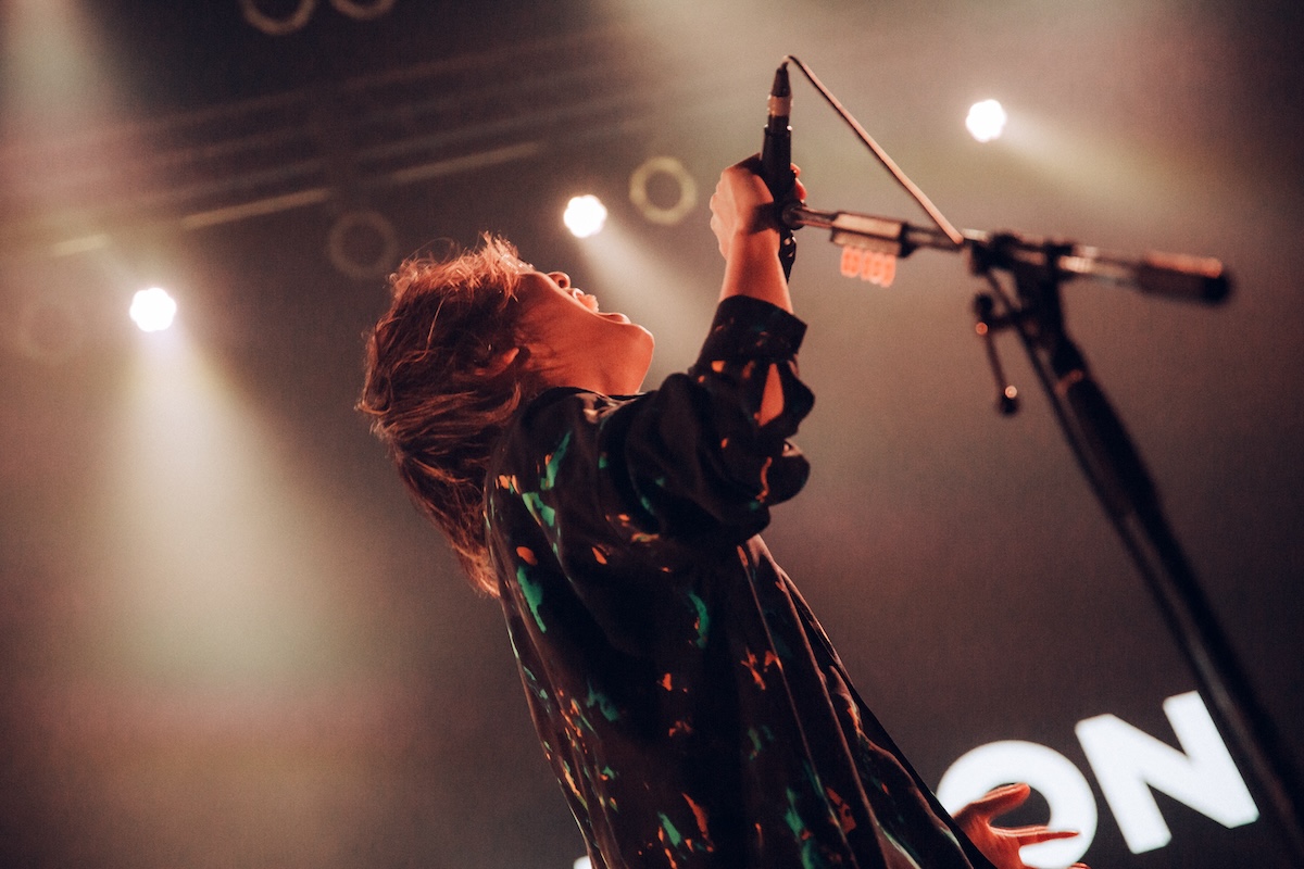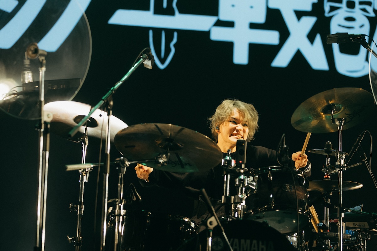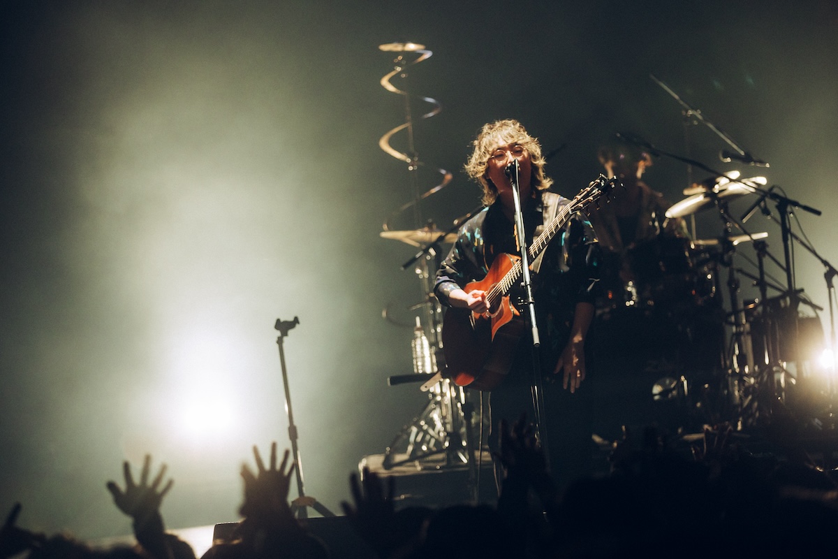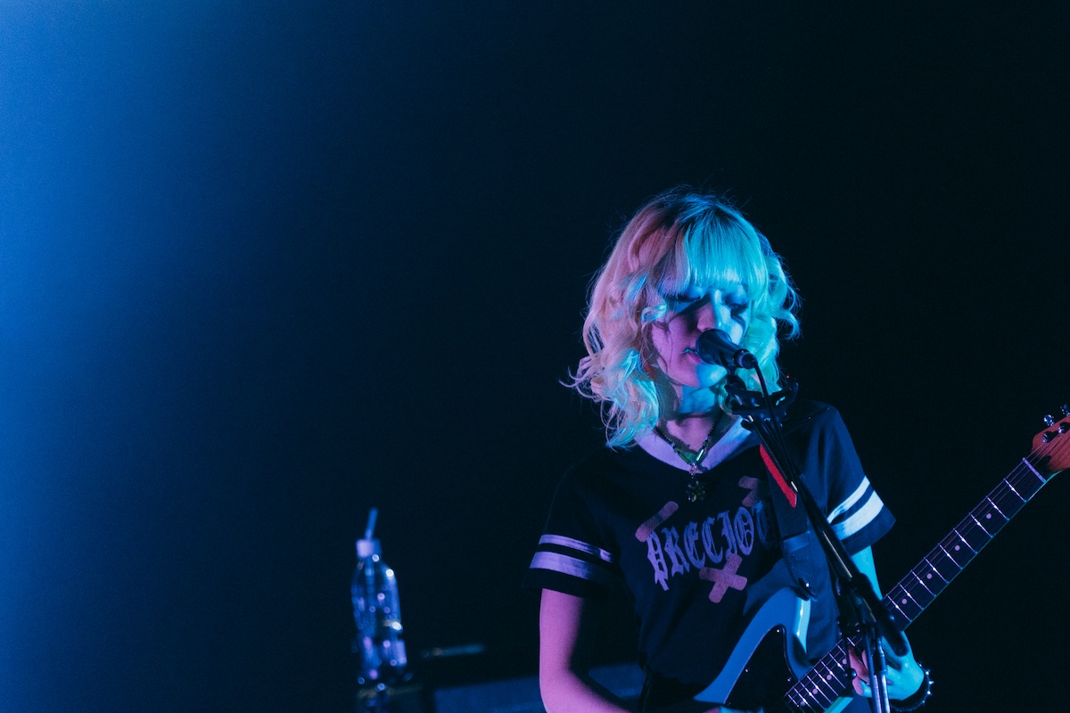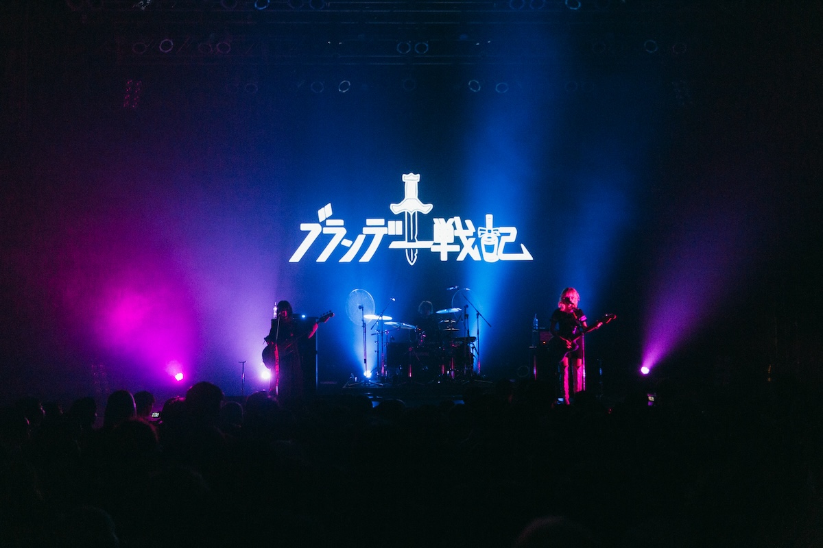 大阪発の3ピースバンド・ブランデー戦記は、ドラムの前で3人で拳を突き合わせた後、「悪夢のような」からライブをスタート。ドリーミーなシンセサウンドによって幽玄な空間が広がっていき、その中をたゆたうように響く蓮月(Vo/Gt)の歌の美しさに深く引き込まれる。と思いきや、視界の全てを塗り替えるような鮮烈なギターソロが轟き、その後も、鉄壁のトライアングルによる渾身のロックンロールチューンが次々と披露されていく。美しく磨き込まれた流麗なバンドサウンドに惚れ惚れする一方で、熱きロックバイブスが獰猛に昂る瞬間が度々訪れるから油断ならない。中盤では、この日リリースされた新曲「The End of the F***ing World」をライブ初披露。軽やかさ、たおやかさを感じさせる曲調ではあるが、全編に深い激情が滲んでいて、エッジーなバンドサウンドが容赦なく牙を剥く後半の展開を含め、非常にスリリングな名演だった。ラストは、「ラストライブ」「ストックホルムの箱」の2連打。まるでロックの本質だけを極限まで突き詰めたかのような、清々しさをも感じさせるアクトだった。