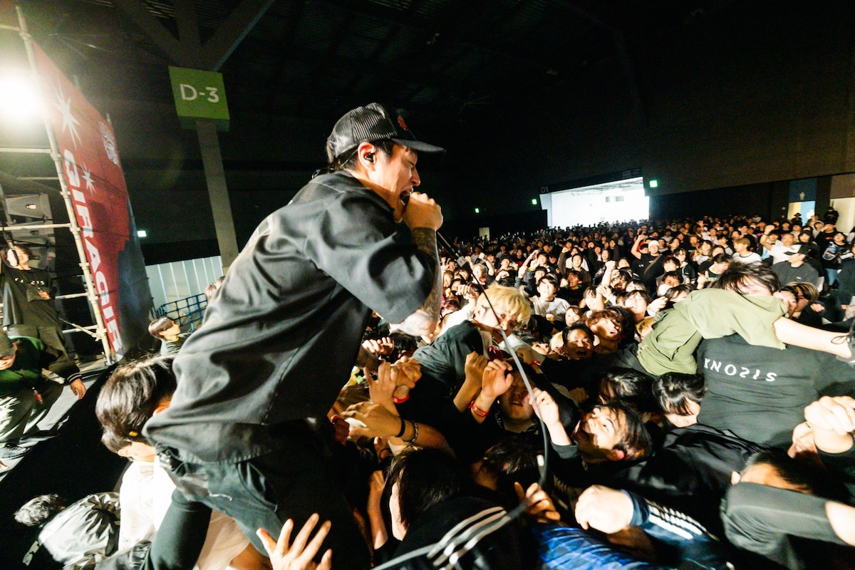 初日はフロアへの動線が狭かったGIRAGIRA STAGEだが、2日目は多少の改善が見られ、前日よりも多くの観客が滞在できるようになっていた。そんなGIRAGIRA STAGEで異彩を放ったのがKnosisだろう。サウンドチェック時にBGMで流れた玉置浩二「メロディー」でオーディエンスがモッシュを始める光景は異様の一言だったが、いざステージが始まると会場はさらに白熱した様子をみせる。Ryo(Vo)が「今日は初めての日本のフェス出演です」と伝えると、フロアは大いに湧き上がる。前日のCrossfaithに続いてこの日はKnosisのギタリストとしてステージに立ったDaiki(Gt)も、エッジの効いたリフワークで観る者を圧倒する。クライマックスではカオティックな中にキャッチーなメロディが備わった「厄災」とFIRE BOYSのカバー「YARUSHIKANEE」を連発し、ライブハウスさながらの熱気でKnosisは自身のステージを全うした。