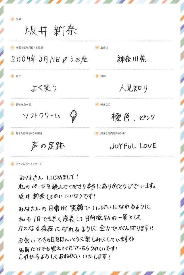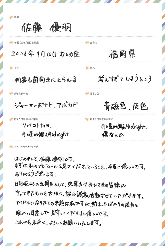 公開された写真では、プロフィール動画とはまた違う表情のメンバーの姿が写し出されている。また、本人手書きのプロフィールでは、生年月日や長所/短所といったパーソナルな部分や、好きな日向坂46の楽曲、MV、ファンへのメッセージなどが公開された。