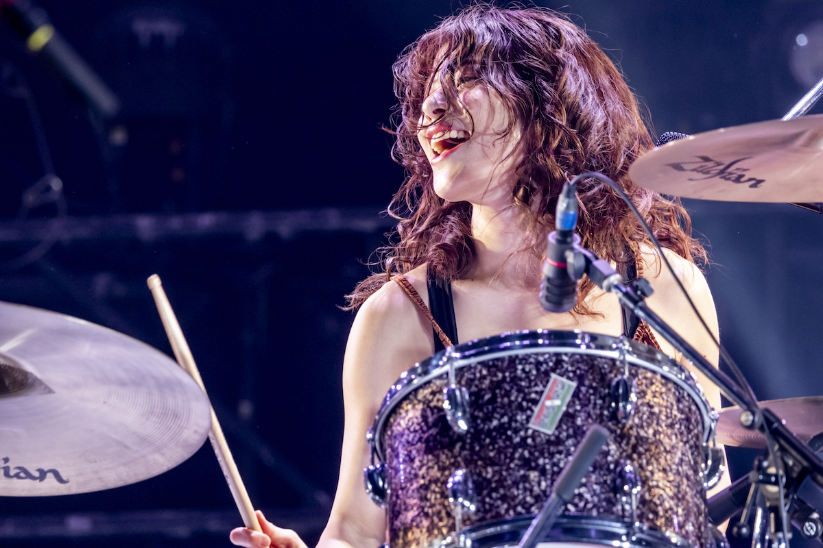 開幕を告げる映像に迎え入れられ、ロゴを冠したネオンが紅白に灯る舞台へ登った宮崎朝子(Gt/Vo) と松岡彩(Ba)、そしてサポートドラムの歌川菜穂を迎えたSHISHAMOは、キュウソの「カワイイだけ」のカバーで祝祭の始まりを告げた。彼女たちが〈かわいいは作れるけど/それ以外君は作れない〉なんて口にする様子はなかなかアイロニカルな手触りさえあるものの、そこには〈さぁ今こそ本当の自分の魅力を取り戻せ〉と歌われる絶対的な自己回帰への共感と、「私たちにもいつも構ってくれて、フェスとかでもキュウソがいると思うとすごく安心するし、そんな存在のキュウソネコカミというバンドがいてくれるだけで嬉しい。感謝やらリスペクトやらをこめて一曲目カバーをやらせていただきました」と語った通りのキュウソへの敬愛の念が濃縮されている。